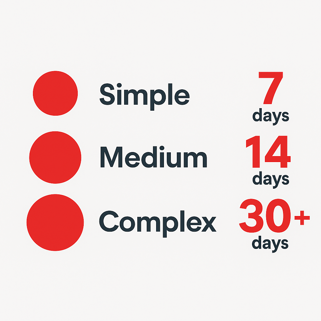 Simple: 7–10 days | Medium: 10–15 days | Complex: 15–21+ days